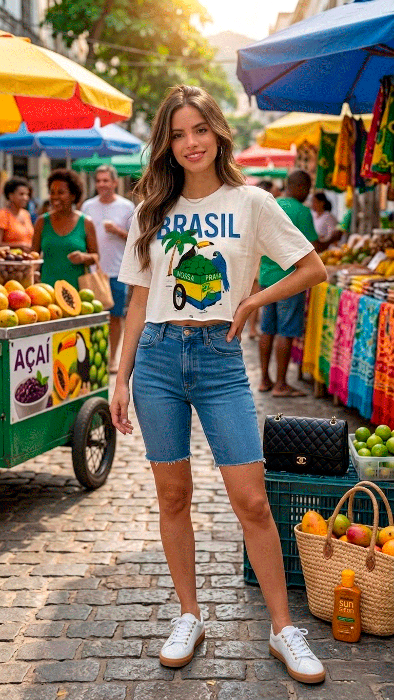 • Look Feira/Praia: Como na foto, combine com uma bermuda jeans de cintura alta e tênis brancos para um visual confortável e super estiloso para um passeio ao ar livre.