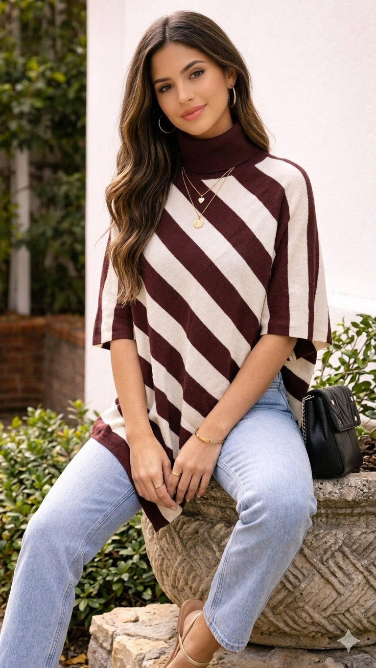 A peça definitiva para os dias de meia estação. Este poncho une a sofisticação das listras diagonais com o conforto incomparável do tricô de toque macio. A gola boba (turtleneck solta) traz um ar elegante, enquanto a modelagem ampla garante liberdade total de movimentos.