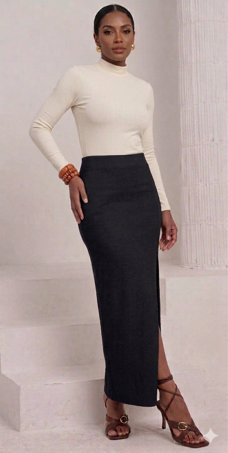 • O Diferencial: A fenda lateral profunda, que quebra a sobriedade do design e confere movimento e sensualidade ao andar.