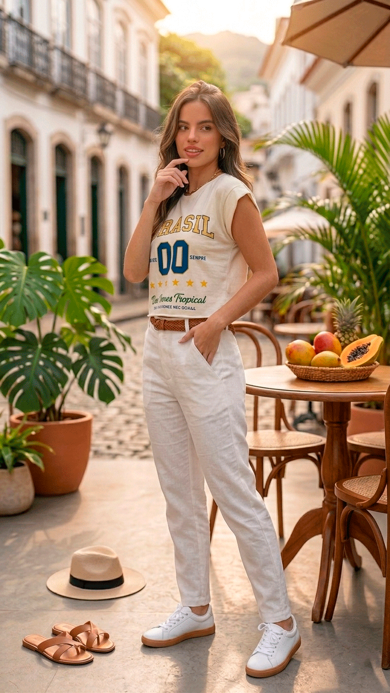 • Total White: Como na foto, combine com uma calça de linho branca e cinto de corda/couro para um visual “clean girl” de verão.